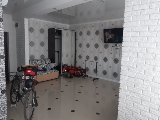 Talot oli suojattu korkealla aidalla sekä tietysti portilla. Portin vieressä oli vartijalle tehty oma koppi. Kopin vasemmalta puolelta meni maan alle tunneli, siellä oli ilmeisesti autoja varten suojat. En ollut oikein varma miten saan avaimen asuntoon. Katselin pienestä portista kulkevia ihmisiä, lopulta pysäytin erään keski-ikäisen miehen ja kysyin häneltä miten pitää toimia. Onnekseni tämä kaveri ymmärsi englanti joten se oli taas pelastukseni. Mies kävi juttelemassa vartijan kanssa. Olin aikaisemmin antanut osoitteen joten hän kysyi mikä talo se on. Pian vartija laski minut portista sisälle. Mies ohjasi minut oikean talon luokse. Jätin pyöräni nojaamaan talon hienoja rappusia vasten. Menin sisälle ensimmäisenä tuli vastaan vartijan pöytä, siinä ei tosin istunut ketään. Odottelin vähän aikaa kunnes päätin soittaa asunnon omistajalle joka vuokraa kämppää. Puhelimeen vastasi mies joka ei osannut englantia. Onneksi vartija saapui juuri parahiksi. Hän ymmärsi nopeasti mistä oli kysymys joten annoin hänelle puhelimeni. Pian hän antoi sen takaisin, hän kertoi että minun pitäisi odottaa puolisen tuntia niin saisin avaimen asuntoon. Vartija viittasi minua menemään ulos odottamaan. Hän itsekkin tuli ulos, ei mennyt kuin hetki kun meillä alkoi juttu luistamaan. Hän kyseli mistä olin tullut ja mitä tein täällä Ukrainassa. Kerroin matkastani halki Europan sekä Romanian. Talon edustalla oli vilkas liikenne, osa pysähtyi katsomaan pyöräni. Vartija kertoi muutamalle uteliaalle tarinaani. Yksi mies lapsen kanssa halusi ottaa valokuvan kun seisoin pyörän vieressä.