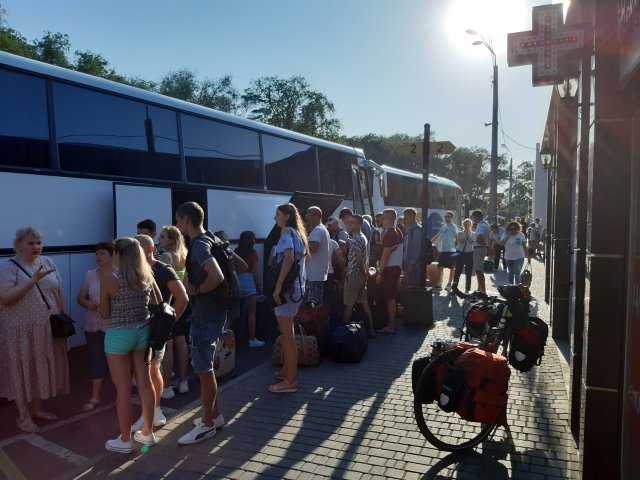 Onneksi ystäväni sai asian selville. Siirryimme 100 metriä tien toiselle puolelle laituri paikka numero 2. Paikalla oli jo useita ihmisä laukkujen sekä muiden tavaroiden kanssa. Työnsin pyörän varjoon missä muutkin olivat.