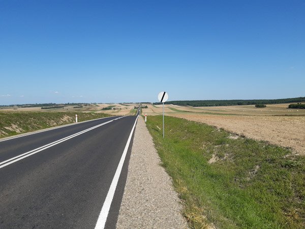 Päätin tänään että en aja Lublini kautta. 34 km ennen käännyin Piotrków Pierwsxy kylän kohdalta ( tie 386 ) vasempaan kohden Pieski kaupunkia. Luulin että olisin päässyt vähän helpommalla kun poistuin päätiellä. Mitä vielä, ensimmäisenä tuli vastaa hemmetin pitkä 7% nousulla oleva kumpare. Aluksi se alkoi loivasti mutta tasaisesti jyrkkeni kohden huippua. Siihen kun sitten lisäsi vastatuulen päivä alkoi näyttämään hyvältä. Työnsi ensimmäiset 2 nousua ylös. Jos tuuli ei olisi ollut niin kova olisin saattanut jaksaa ajaa mäet ylös.