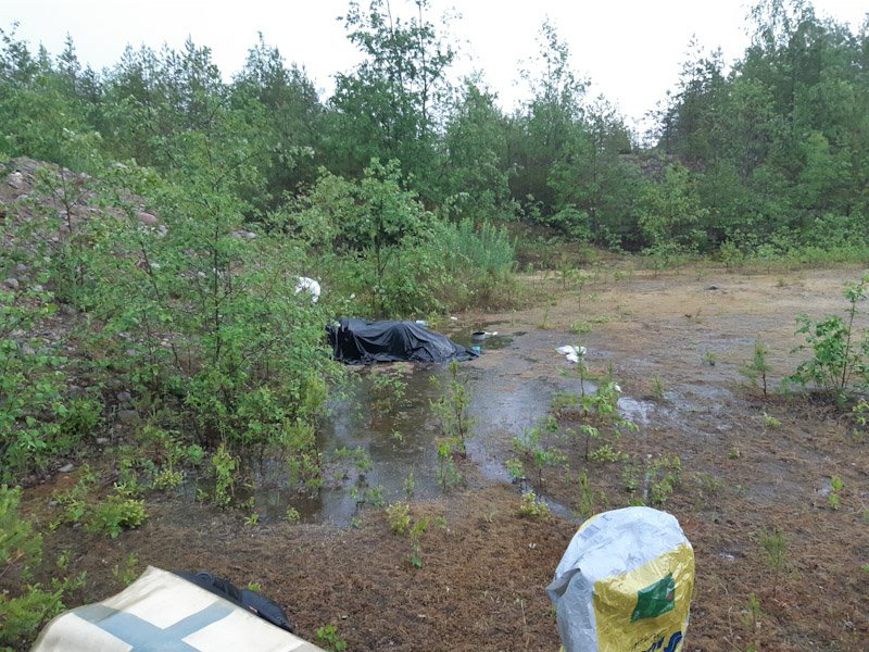 Yritin kävellä ripeästi takaisin mänty alle etten kastuisi enempää. Vesisade ei näyttänyt rauhoittuvan sitten millään. Paikka mihin oli kasannut varusteet oli sammaleen peittämä pieni syvennys. En ollut huomannut sitä eilen, olin kait jonkin verran väsynyt. Katselin kauhuissani kun veden pinta nousi ja nousi. Tässä vaiheessa polkupyörä otti ja kaatui toisen kerran. Voi perkele. Tällä kertaa rojut pysyivät laukun sisällä. Siirsin pyörän aivan männyn lähelle koska siinä näkyi selvää soraa ilman sammalta. Ukkonen meni vauhdilla yli. Sade hiljeni sitä mukaa kun ukkosen ääni hiljeni. Yritin pysyä positiivisena vaikka tiesinkin mitä tulisin näkemään kun siirtäisin pohjakankaan laukkujen päältä pois.