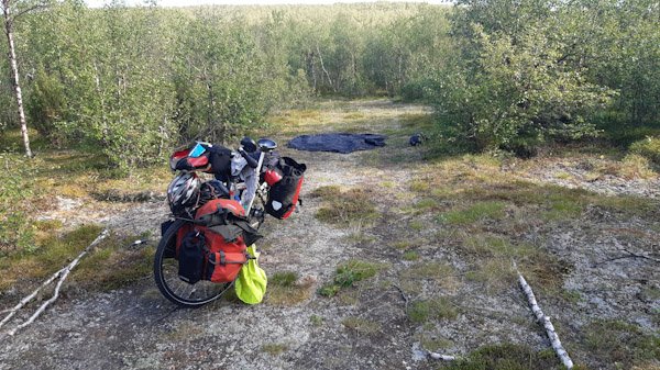 Saatuani vedet, palasin takaisin päin polkupyörällä 200 metriä. Olin nähnyt sopivan hiekkatie liittymän joka nousi koivikkoista rinnettä loivasti ylös. Kävin ensin tutkimassa tietä ennen kuin työnsin pyörää tietä pitkin ylös. Löysin sopivan paikan jänkäkoivikossa olevan tien keskeltä.
