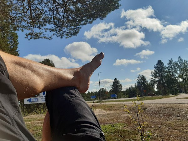 Olin ostanut kaupasta soijakaakao juomaa sekä kaksi viineriä. Risteys mistä käännytään Norjaan, sen lähellä on rakennuksia missä on muutama liike. Näiden lähistöllä, kadun varressa oli puistonpenkki mihin jäin syömään herkkuja. Syötyäni heittäydyn penkille selälleni. Aurinko paistoi lämpimästi mutta tuuli oli kylmä. Penkin selkänoja oli sopivasti tuulen tiellä joten penkillä oli mukava pötkötellä. Lepäisin ja muistelin ulkomaan matkojani missä olin myös laiskotellut samanlailla, aah se vasta on elämää.