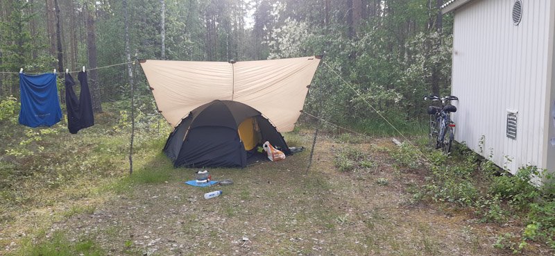 Tein Aamulla sellaisen ratkaisun että purin heti leirin, join jogurttia sekä piimää aamupalaksi. En alkanut tekemään sen kummemmin ruokaa. Laitoin tavarat pikkuhiljaa kasaan yrittäen käydä välillä hoitamassa”luonto kutsuu” asioita. Maha oli vain sen verran kovana ja ne hyttyset.