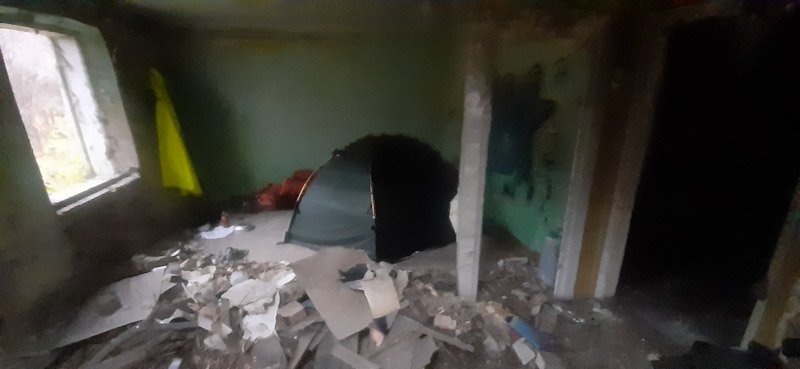 Kävin hakemassa pyörän ensin tien varresta ettei se kiinnittäisi liikaa huomiota.sen jälkeen menin tutkimaan taloa tarkemmin. Toinen puoli taloa oli huonossa kunnossa. Osa kattoa oli romahtanut, toinen oli jonkinlaisessa kunnossa. Löysin myös patjan tyyppisen eräästä nurkasta . Limupullo oli jätetty puoliksi juomatta ikkunalaudalle. Katselin tarkemmin patjaa, sen päälle oli tippunut maalia seinästä joten patjalla ei oltu nukuttu vähään aikaan. Se oli myös märkä.