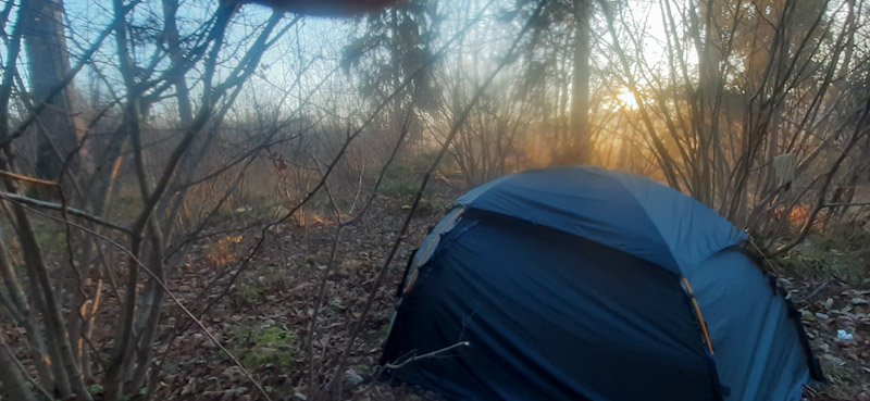 Laitoin ruokaa ihastellen auringon nousua metsikön takaa. Aamu kosteus näkyi selvästi kun se leijaili puiden lomassa. Muutama talitintti tuli pyörimään leirin ympärille. Ne pyrähtelivät pusikoita toiseen, suunnaten pian metsän laitaan ja sirkuttaen mennessään.