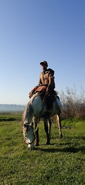 Olin jo tänä aamuna herännyt 7 aikaan kun kuulin hevosekavioiden ääntä. Joku puhui koko ajan hepalle ja hevon koppsutteli eteen päin. Päätin katsoa teltan oviaukosta mitä ulkona tapahtuu. Poika tuli valkoisella vuoristohevosella laukkaa pitkin peltotietä. Kun näin pojan heilutin kättäni hänelle. Poika ohjasi hevosen teltan luokse ja pysähtyi vähän matkan päähän. Katselin hevosta ja ratsastajaa vähän aikaa kunnes tajusin ottaa valokuvan..Poika otti myös kuvan meidän leiristä. Pian hän lähti ratsastamaan pois kohden samaa paikkaa missä olimme nähneet hänet ensimmäisen kerran.