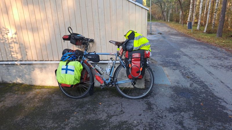 Kun lähtö aamu saapui niin nousin aikaisin ylös. Söin ensin ja aloin sen jälkeen katselemaan tavaroita ja miettimään olenko ottanut kaikki varmasti mukaani. Kyllä, kaikki oli mukana. Kannoin kaikki tavarat ensin ulos, ulko oven eteen , sen jälkeen olikin jo pyörän vuoro.