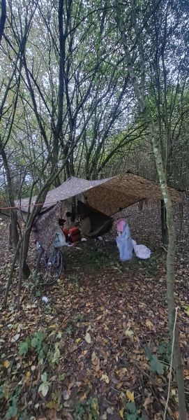 Nyt minulla ei ollut sitä mahdollisuutta koska maahan ei voinut laittaa telttaa. Aloin hämärässä laittamaan tarppia ja riippumatto metsikköön. Kuin varkain , se sumu alkoi ilmestymään uudestaan. Aloin melkein panikoimaan koska minulla ei ollut varasuunnitelmaa enkä voinut tehdä muutakaan.