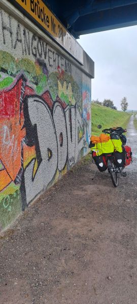 Heräsin aamulla pieneen sateen ropinaa. En ollut laittanut tarppia teltan suojaksi joten nousin ylös . Sain teltan aika kuivana kasaan joten olin tyytyväinen. Elbe joelle oli matkaa reilut 30km. päivällä sade oli satunnaista eikä se edes kastellut kunnolla. Elbe joen rannassa oli pitkät autojono. kolme lauttaa pitivät huolen siitä että jonoja ei päässyt syntymään pahemmin. Elbe joki on levä, näin ison konttilaivan menevän kohden Hampuria täyteen lastattuna. Myös purjevene oli liikenteessä kun ohitimme Elbe joen keskellä ollutta saarta. Leiripaikan etsiminen kävi tänään työstä, myös keittimessä käyttämäni bensa oli kovan etsimisen takana. Ilta päättyi sateen ropinaa kuunnellen teltassa. Toivotravasti aamu tuo tullessaan paremman päivän.