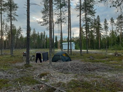 Aamulla satoi vähän vettä, odottelin että sade loppui. Onneksi kuuro oli lyhyt. Teltan pinnassa oli jonkin verran vettä. Otin roinat sisältä pois että saisin ensimmäisenä sen kasaan. Kuivasin viledalla teltan pinnan, sen jälkeen otin kolme telttakeppiä pois . Pian olin saanut teltan kasaan. Tein nopeasti aamupalan että pääsisin lähtemään kohden Utsjokea .